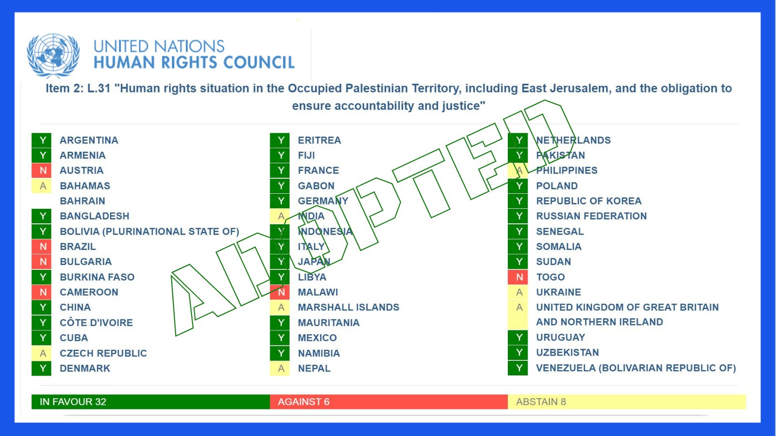 En los últimos días de su sesión anual en Ginebra, el Consejo de Derechos Humanos de Naciones Unidas, máxima instancia de Naciones Unidas en materia de derechos humanos, adoptó la resolución titulada "Human Rights situation in the Occupied Palestinian Territory, including East Jerusalem, and the obligation to ensure accountability and justice" (véase texto completo).