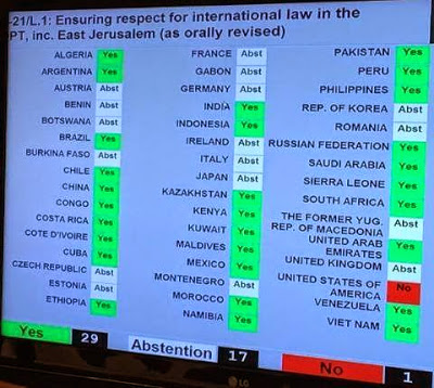 Foto del tablero de votación del 23 de julio del 2014, al votarse una resolución del Consejo de Derechos Humanos de Naciones creando una comisión de investigación sobre la ofensiva militar isarelí en Gaza (29 votos a favor, 17 abstenciones y un solo voto en contra), extraída de nota nuestra sobre los alcances de esta resolución
