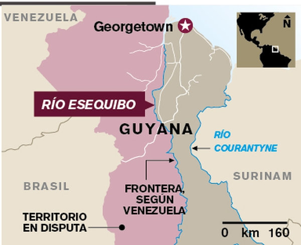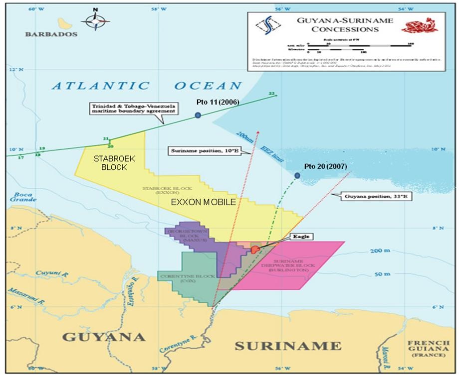 Como se puede observar, Guyana reclama que la sentencia de 1899 sea considerada como jurídicamente válida, derivando de ello el trazado de la frontera terrestre y su proyección en materia de delimitación marítima. Tal y como se puede apreciar en el mapa anteriormente reproducido, la delimitación marítima es de suma importancia para Guyana, al haber procedido a conceder amplias zonas marítimas para la exploración en materia de hidrocarburos a la empresa Exxon Mobil.