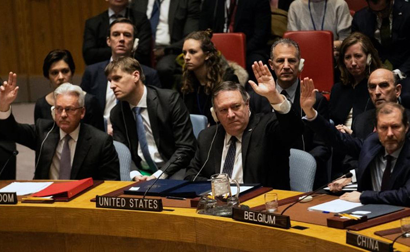 Foto del Secretario de Estado norteamericano rodeado de los delegados de Reino Unido y de Bélgica durante la votación del orden del día del Consejo de Seguridad durante el pasado 26 de enero del 2019. Foto extraída de artículo de prensa de El Comercio.